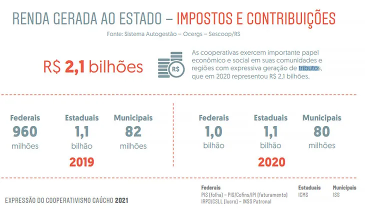 As cooperativas do RS geraram R$ 2,1 bilhões de tributos em 2020. Desse montante, R$ 1,1 bilhão foram em tributos estaduais, R$ 1 bilhão em tributos federais e R$ 80 milhões em municipais.
