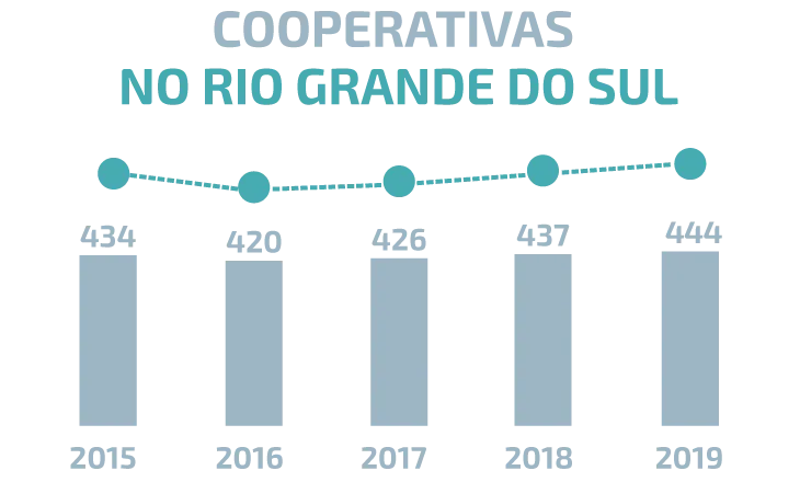 Nos últimos anos, o número de cooperativas registradas junto à Organização das Cooperativas do Estado do Rio Grande do Sul tem aumentado. Em 2020, o número atualizado chega a 448 cooperativas, com prevalência do ramo Agropecuário, que reúne 130 cooperativas.